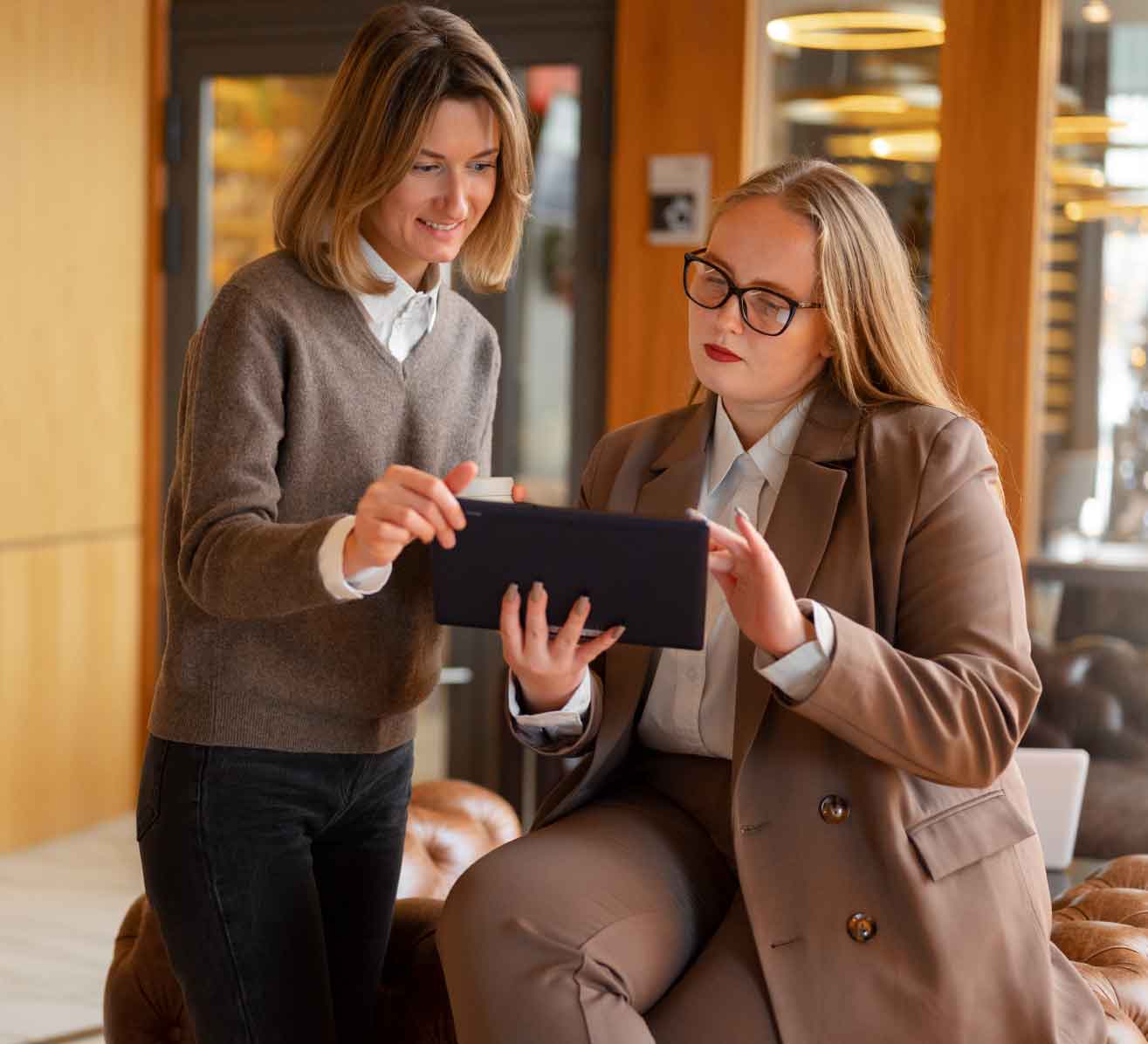 Duas mulheres utilizando celular ao conversar